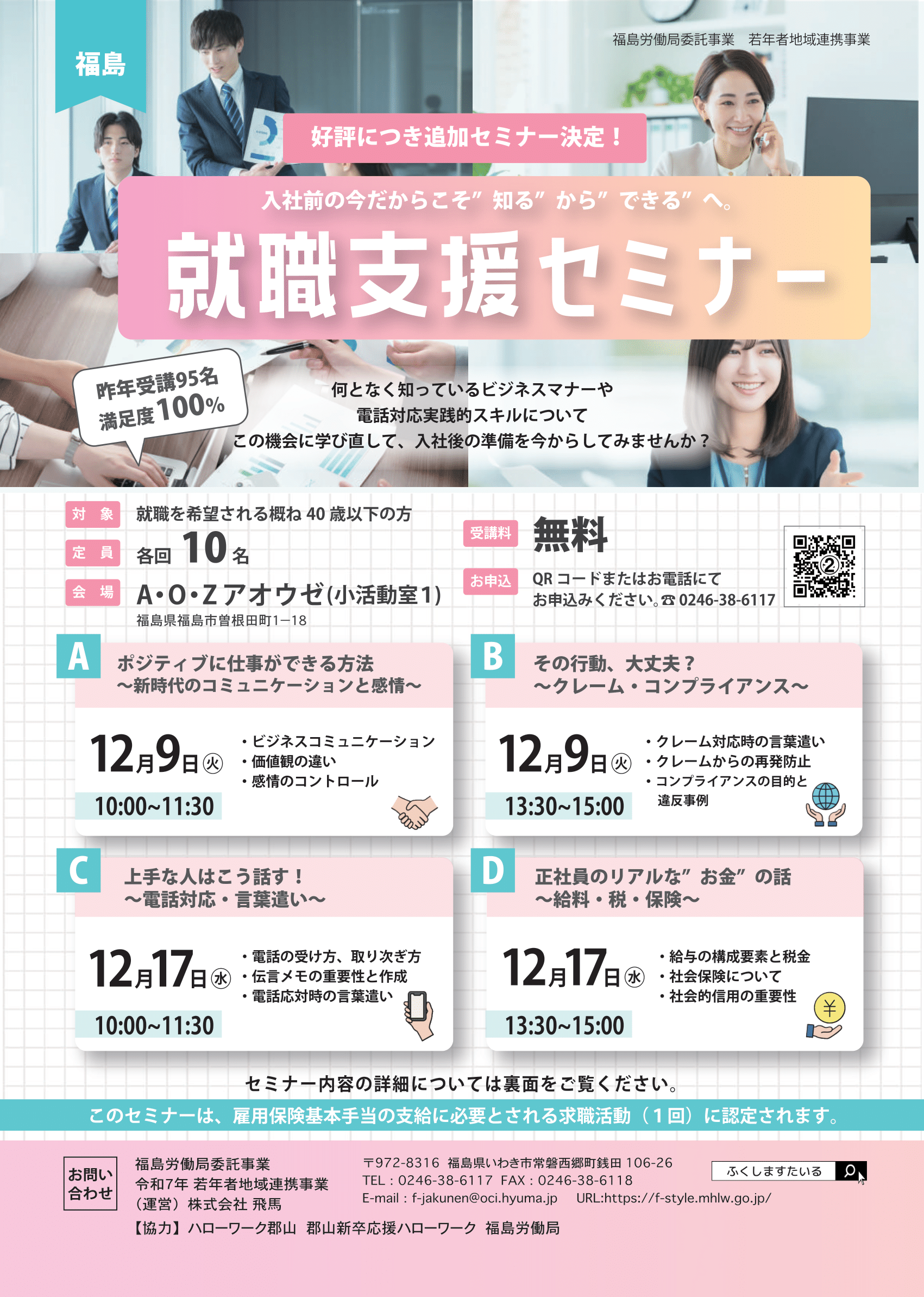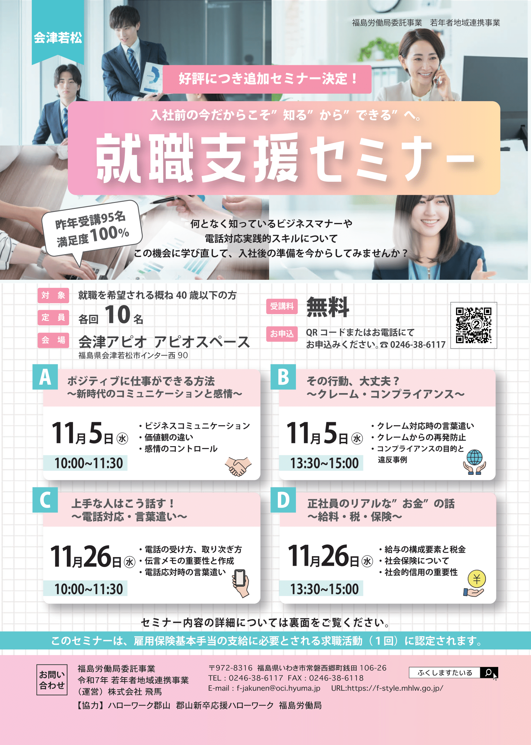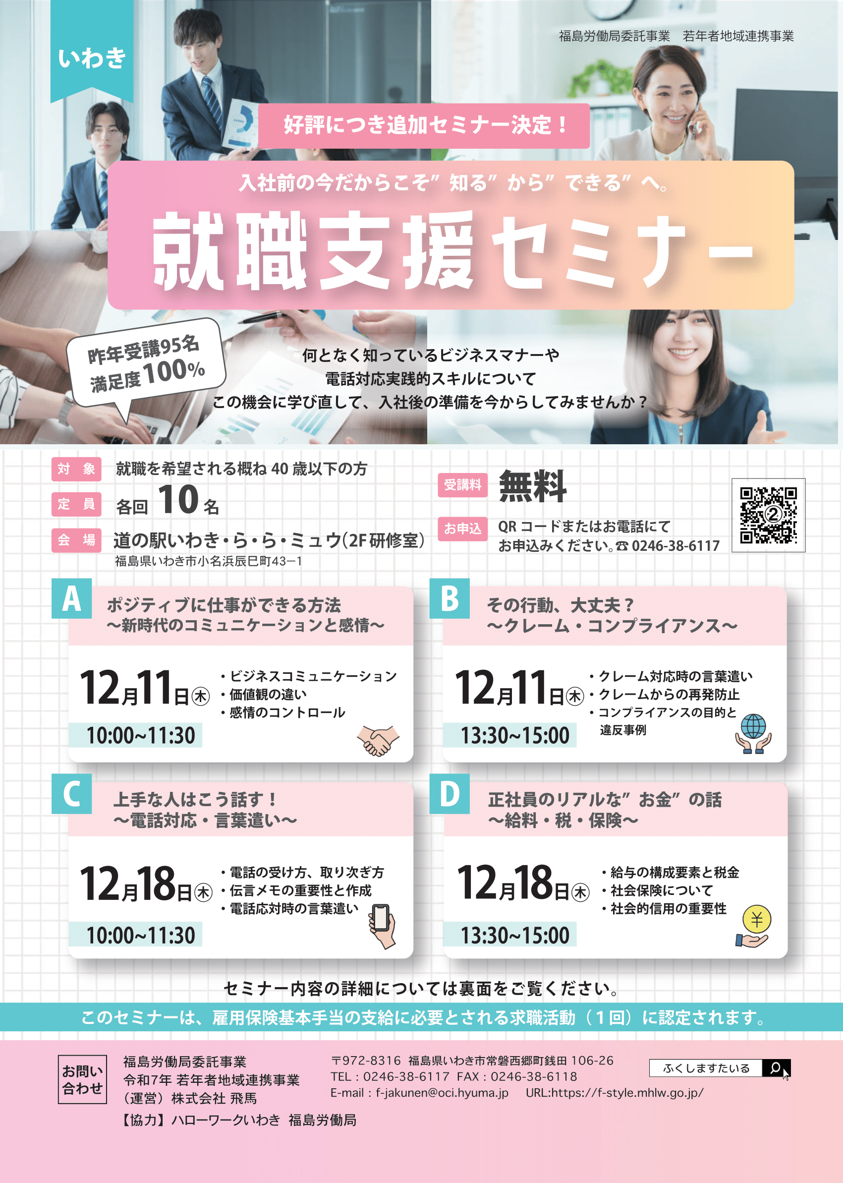 福島労働局委託事業令和6年度若年者地域連携事業(運営)株式会社 飛馬〒972ー8316 福島県いわき市常磐西郷町銭田106ー26TEL:0246ー38ー6117Email:f-jakunen@oci.hyuma.jp